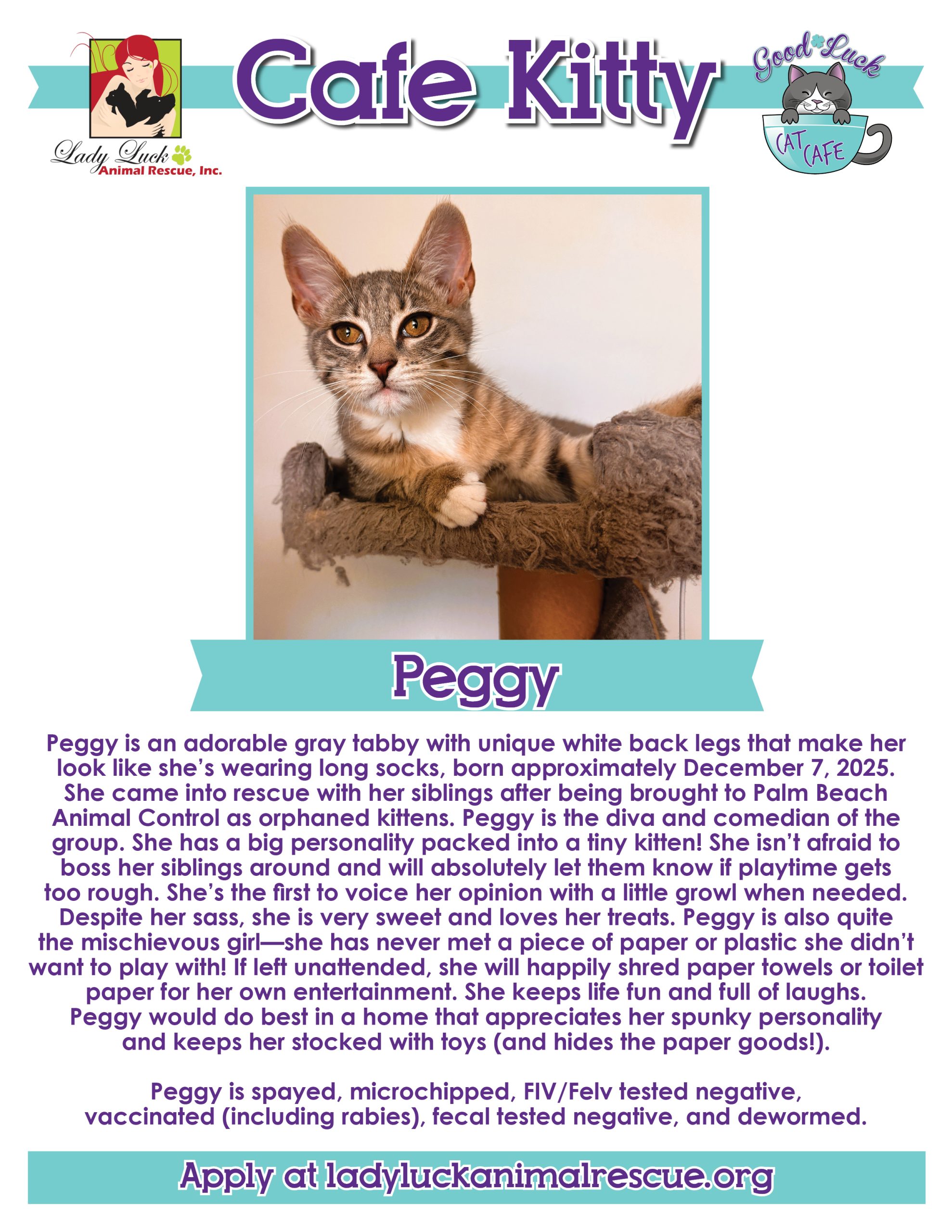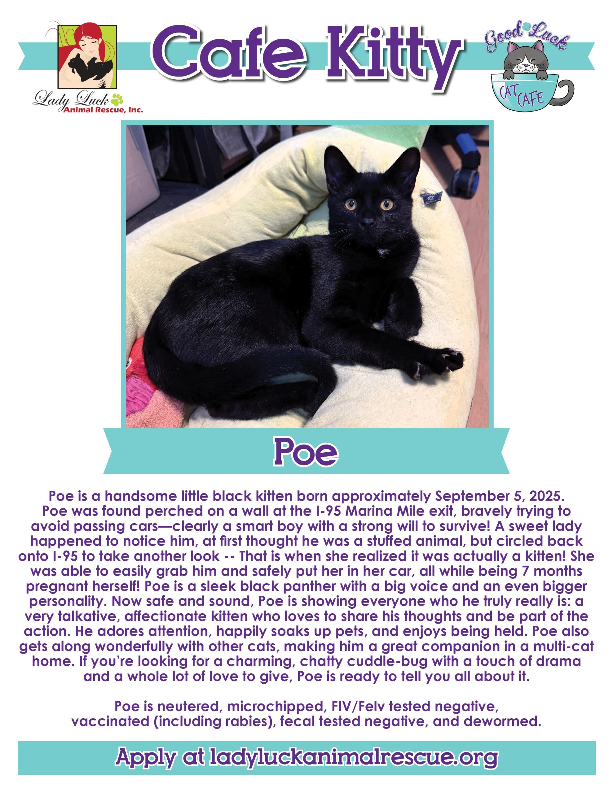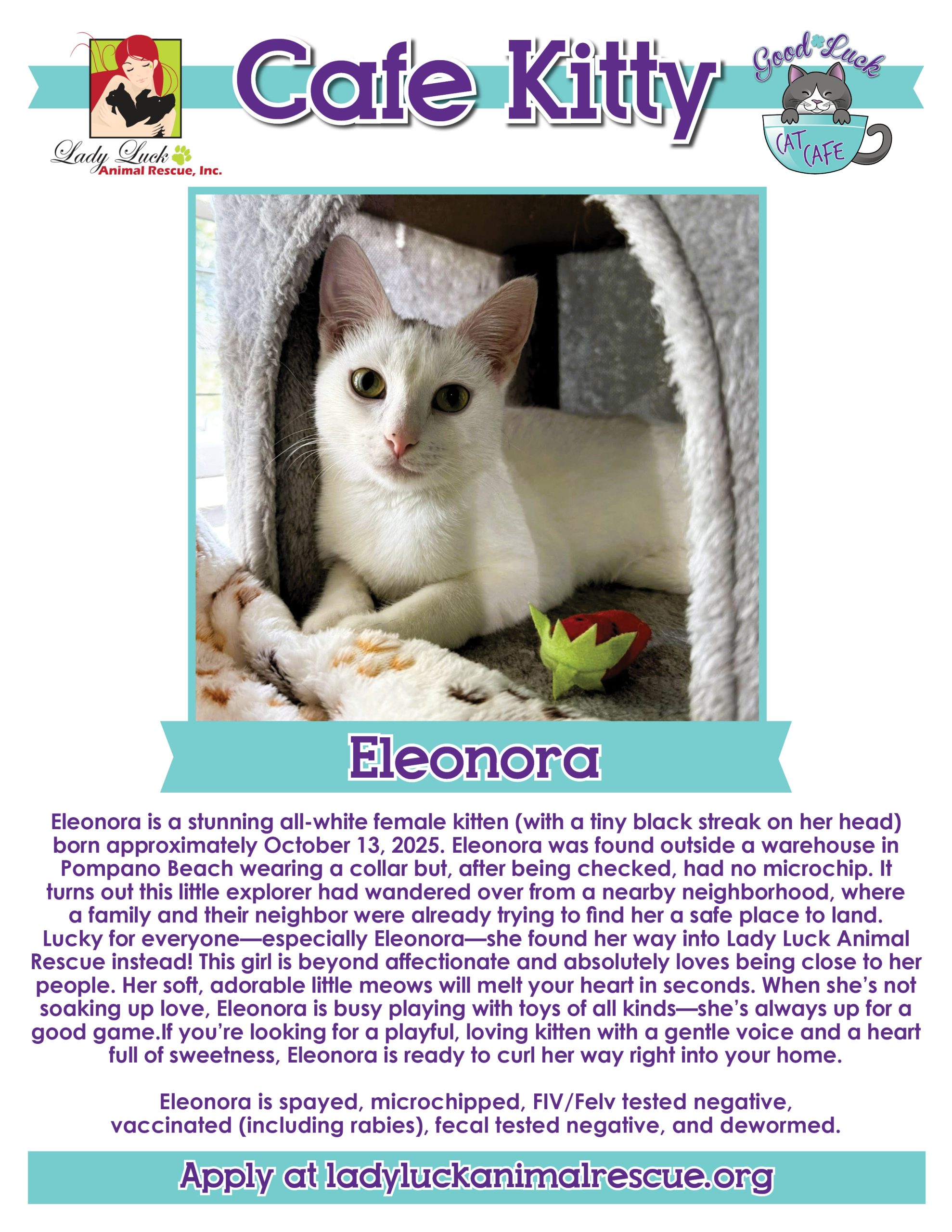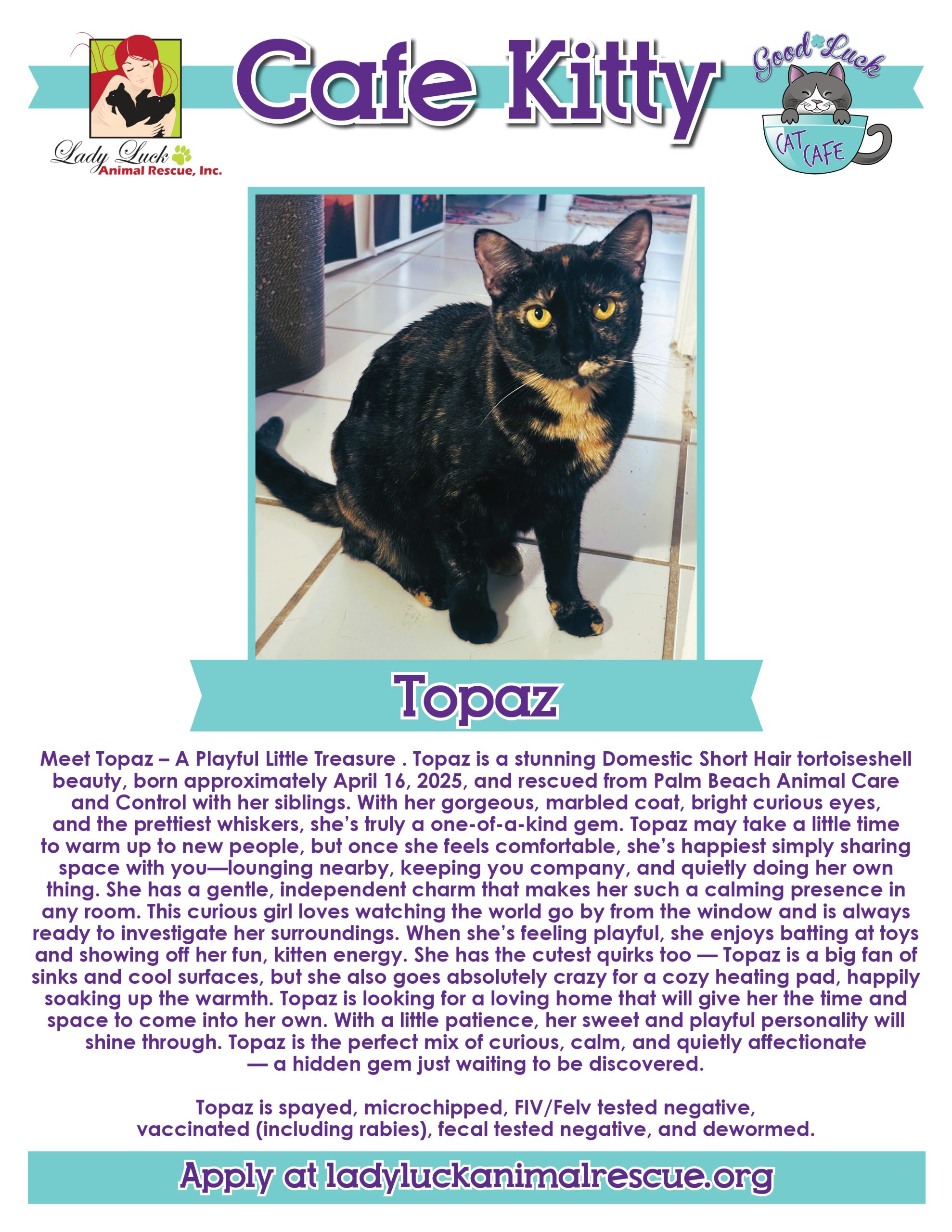 All of the kitties in the Good Luck Cat Cafe are fully vetted, up to date on all age-appropriate shots, spayed/neutered, microchipped, and ready for their forever homes. The adoption fee for each cat is $100 and this includes a home visit before completing the process. Please ask for details in the cafe.