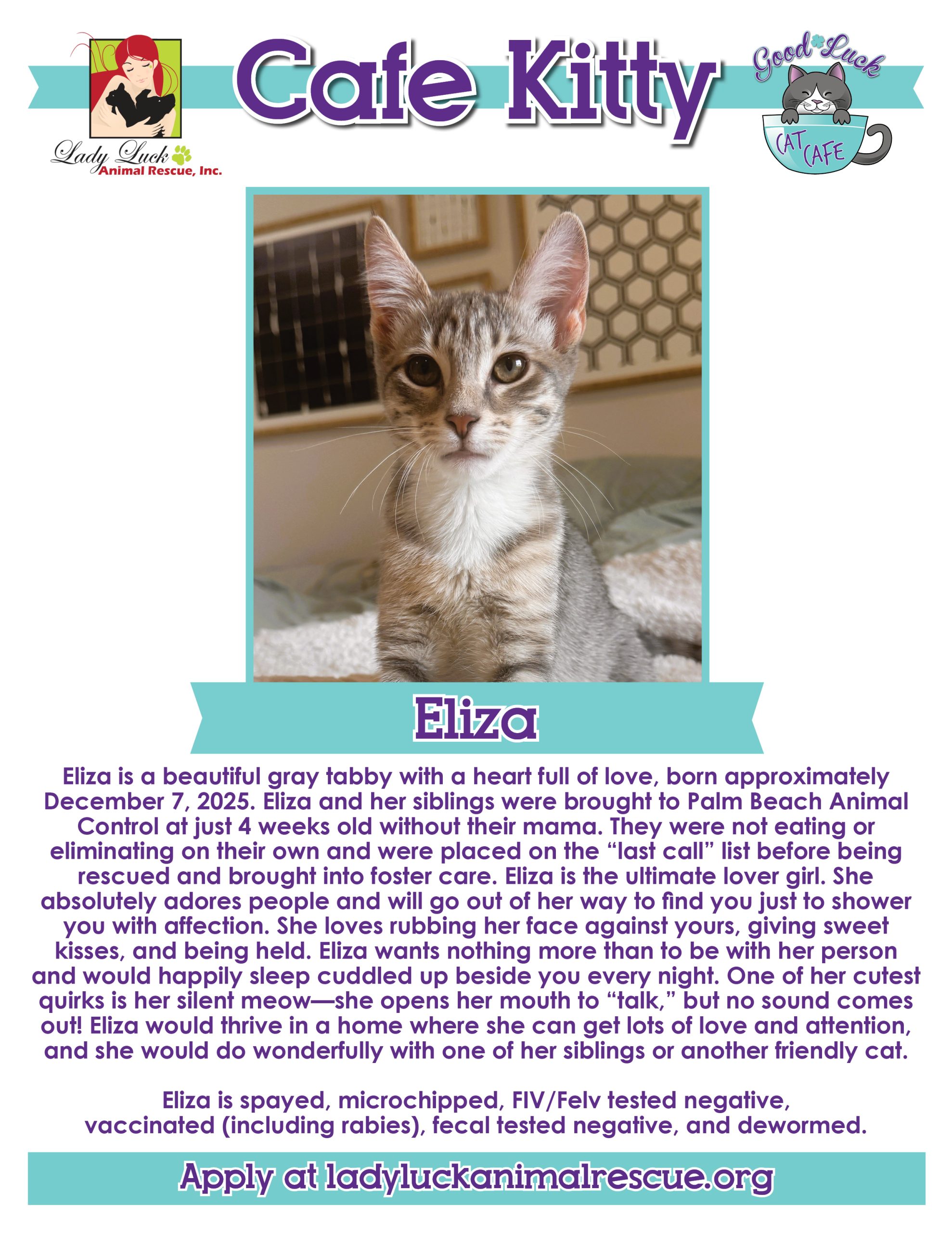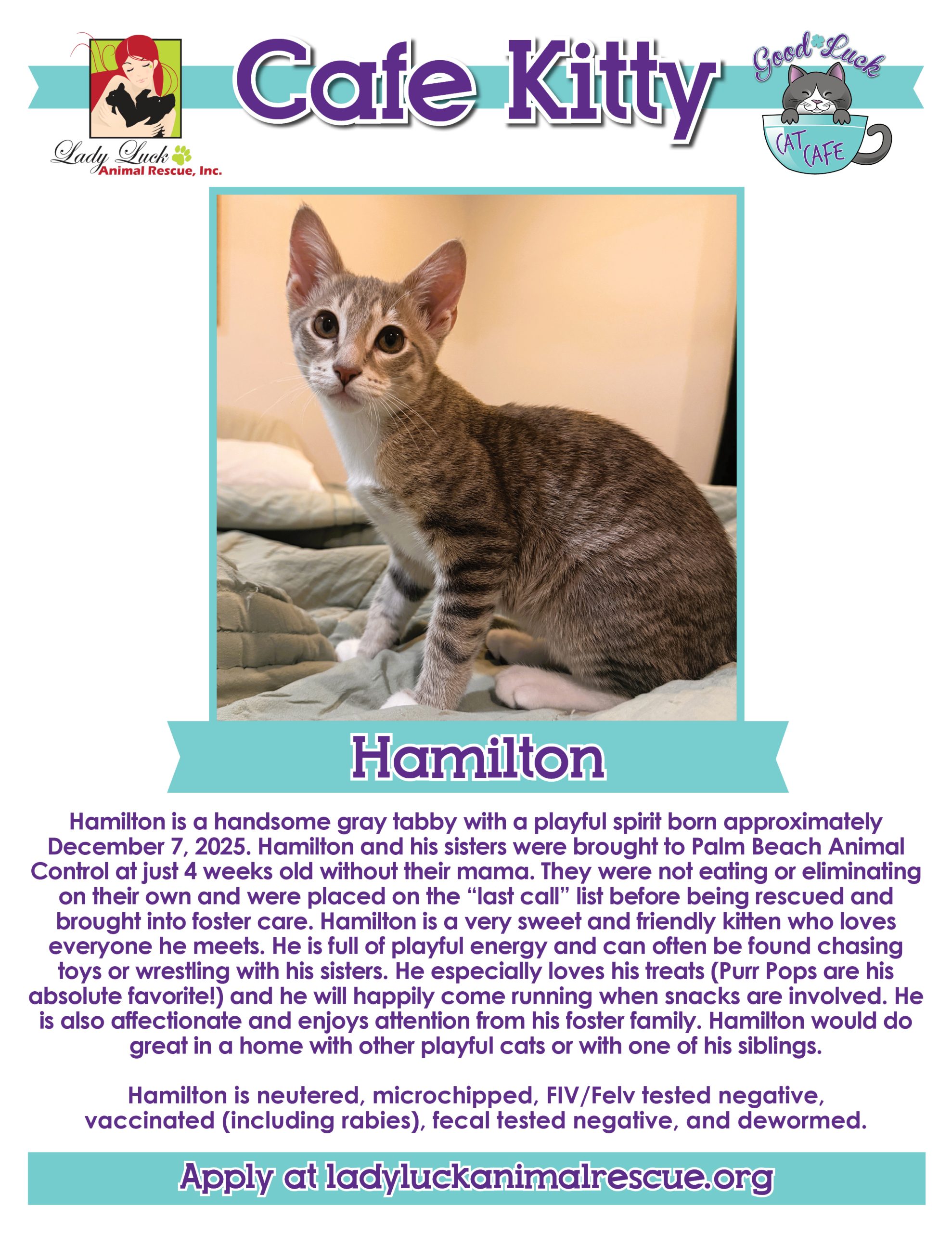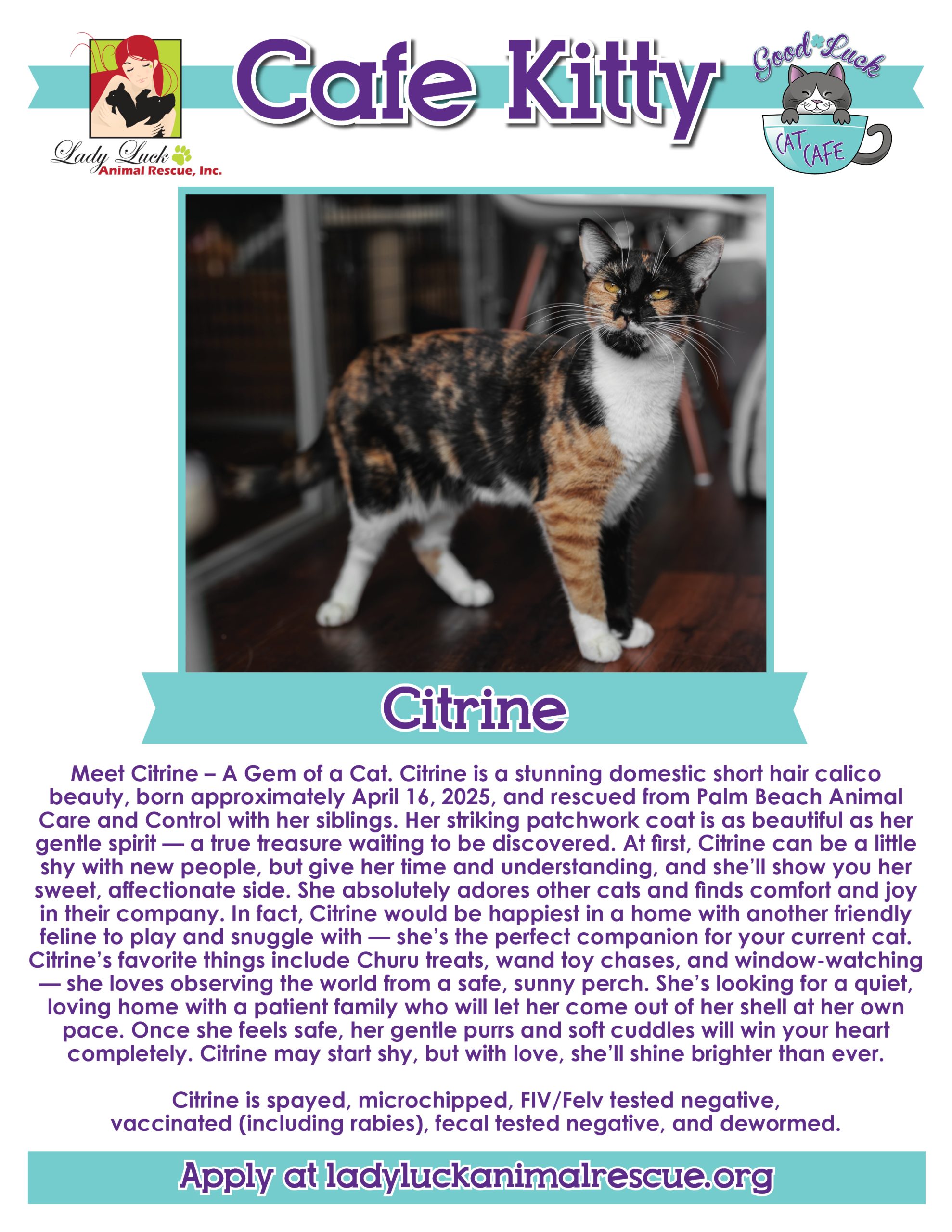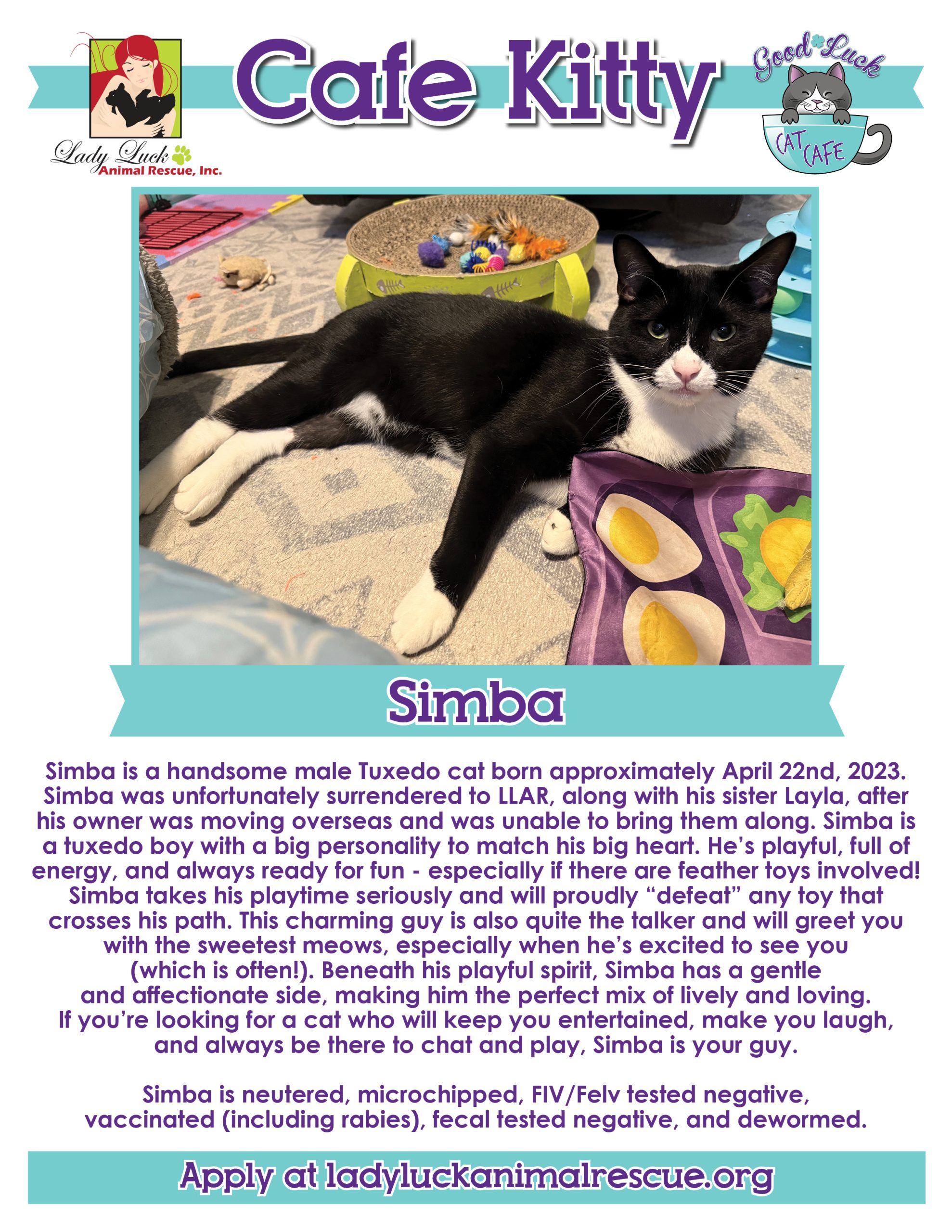 All of the kitties in the Good Luck Cat Cafe are fully vetted, up to date on all age-appropriate shots, spayed/neutered, microchipped, and ready for their forever homes. The adoption fee for each cat is $100 and this includes a home visit before completing the process. Please ask for details in the cafe.