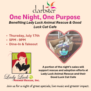 Join us on Thursday, July 17th as we support Lady Luck Animal Rescue and their incredible Good Luck Cat Cafe. A portion of the evening’s dine-in and takeout sales will go toward their mission of rescuing, caring for, and rehoming South Florida’s most vulnerable animals.